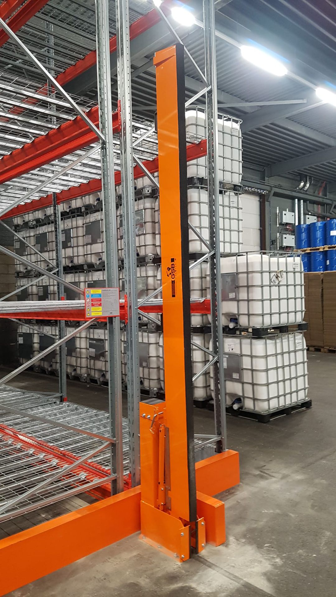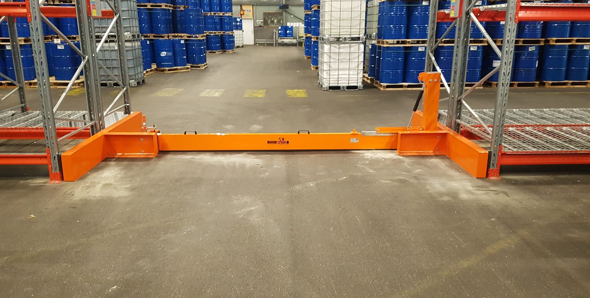 Die Löschwasserbarriere besteht auf der einen Seite aus einem am Boden befestigten Stahlscharnier, auf der gegenüberliegenden Seite aus einem Stück U-Profil-Stahl-Aufnahme sowie der entsprechend der Rückhaltehöhe geforderten Leichtmetallbarriere. Durch einen Sicherungsstift wird die Leichtmetallbarriere in der senkrechten Ruhelage gehalten. Nach Entsicherung schwenkt man die Barriere von Hand in die Verschlusslage. Die Verriegelung erfolgt mittels Vertikalspanner.